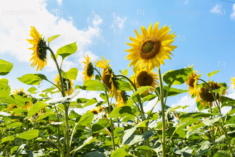 Цветущие подсолнухи на фоне голубого неба с облаками