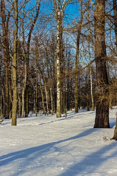 Деревья в зимнем лесу в солнечный день