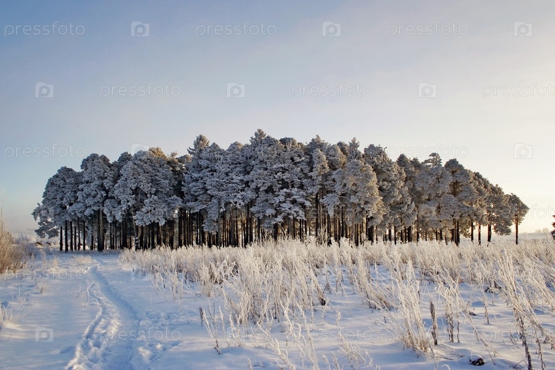 Замерзшие сосны в лесу в холодный зимний день
