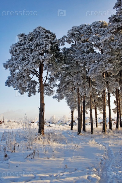 Сосновый лес и деревня в зимний день
