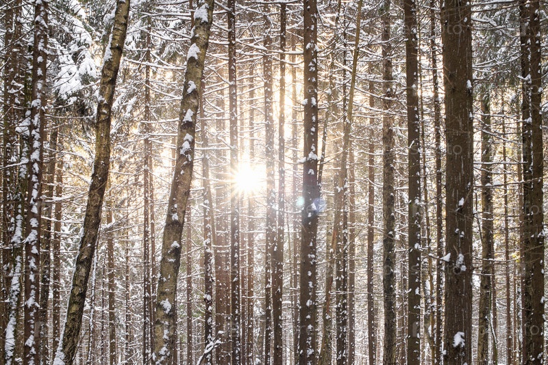 Солнечный свет пробивается сквозь стволы деревьев в зимнем лесу