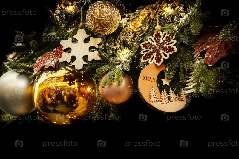 Новогоднее украшение с золотыми шарами и деревянными снежинками и еловыми ветками на черном фоне. С рождеством и новым годом фон открытки