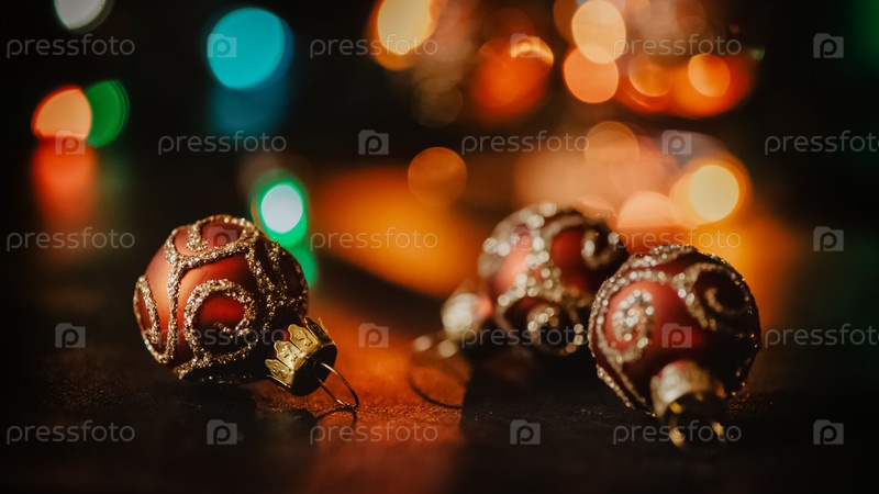 Красные елочные шары на фоне темной гирлянды с подсветкой. Тематическая карта зимнего отдыха. Концепция украшения с Новым годом и Рождеством