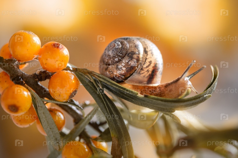 Улитка ползает по ветке дикой облепихи