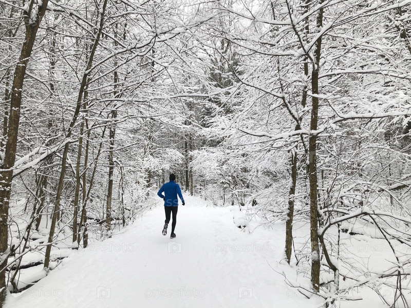 Мужчина занимается бегом в зимнем лесу, бегом по заснеженной дороге, активным отдыхом, здоровым образом жизни