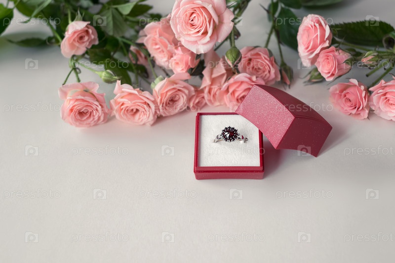 Украшенное драгоценными камнями обручальное кольцо в открытой красной шкатулке, окруженной бледно-розовыми розами. празднование дня святого валентина