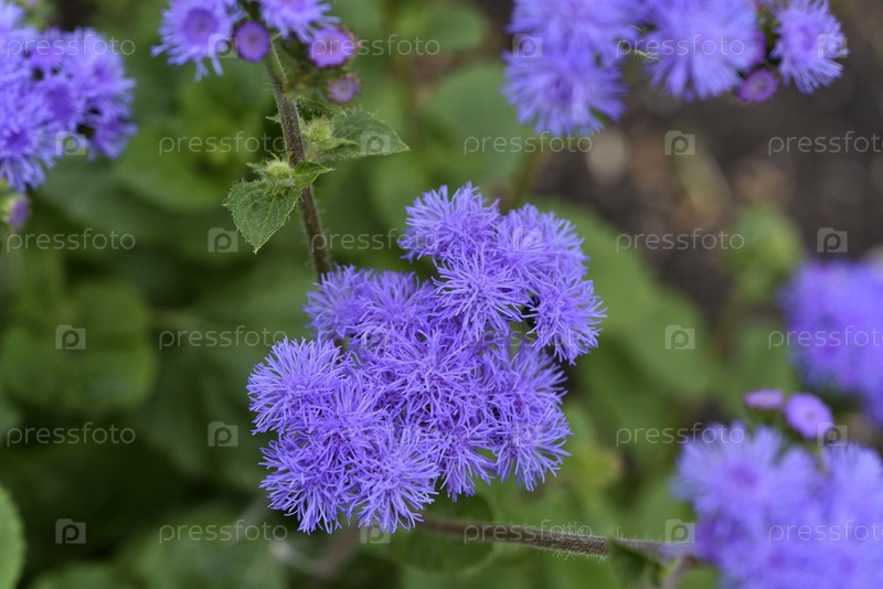 Фиолетовые цветы в летнем саду Куст Ageratum conyzoides Маленькие цветки агератума