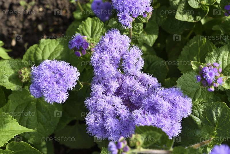 Фиолетовые цветы в летнем саду Куст Ageratum conyzoides Маленькие цветки агератума