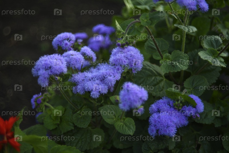 Фиолетовые цветы в летнем саду Куст Ageratum conyzoides Маленькие цветки агератума
