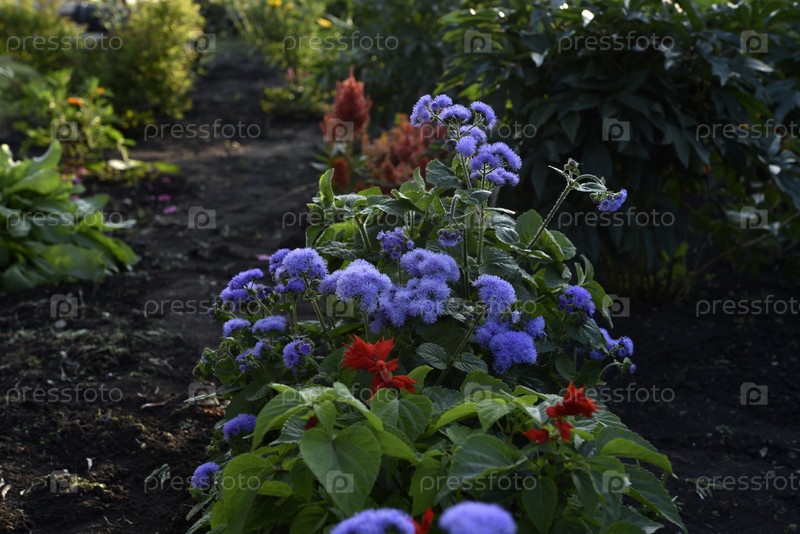 Фиолетовые цветы в летнем саду Куст Ageratum conyzoides Маленькие цветки агератума