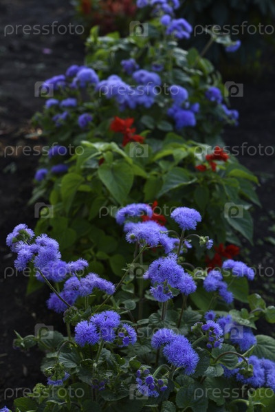 Фиолетовые цветы в летнем саду Куст Ageratum conyzoides Маленькие цветки агератума
