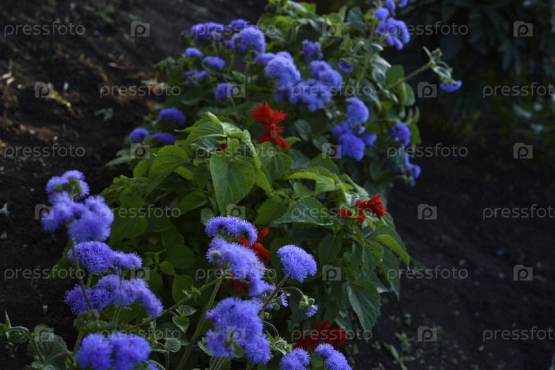 Фиолетовые цветы в летнем саду Куст Ageratum conyzoides Маленькие цветки агератума