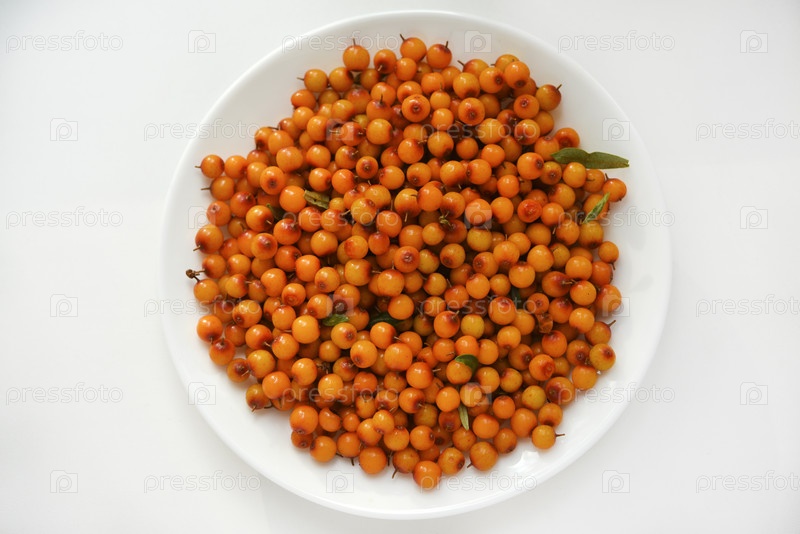 Оранжевые ягоды облепихи на белой тарелке. Гиппофаи