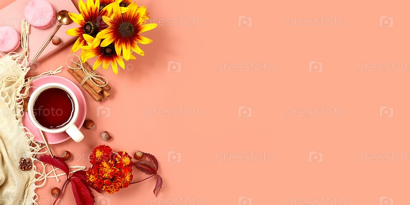 Осенний баннер с горячим чаем в стеклянной чашке, орехами и специями на фоне сезонных цветов и листьев, уютная теплая концепция, привет осень, стиль хюгге, выборочный фокус, вид сверху, место для текста,