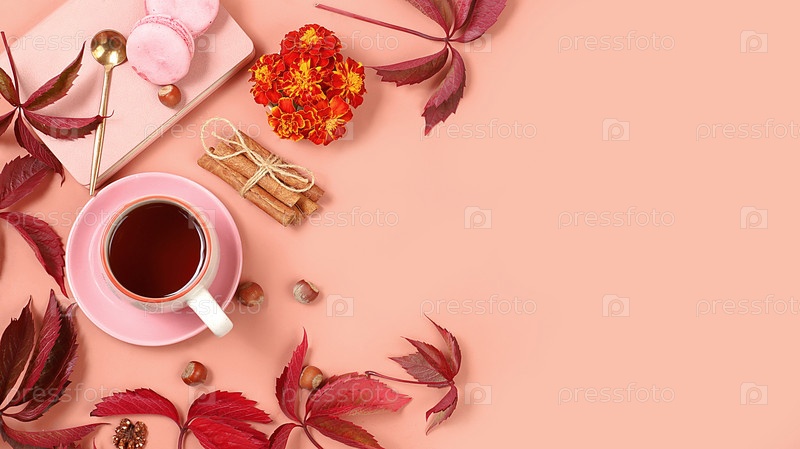 Осенний баннер с горячим чаем в стеклянной чашке, орехами и специями на фоне сезонных цветов и листьев, уютная теплая концепция, привет осень, стиль хюгге, выборочный фокус, вид сверху, место для текста,