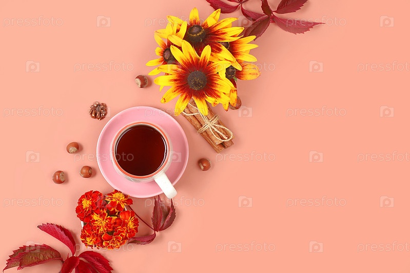Осенний баннер с горячим чаем в стеклянной чашке, орехами и специями на фоне сезонных цветов и листьев, уютная теплая концепция, привет осень, стиль хюгге, выборочный фокус, вид сверху, место для текста,