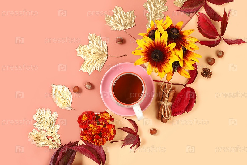 Осенний баннер с горячим чаем в стеклянной чашке, орехами и специями на фоне сезонных цветов и листьев, уютная теплая концепция, привет осень, стиль хюгге, выборочный фокус, вид сверху, место для текста,