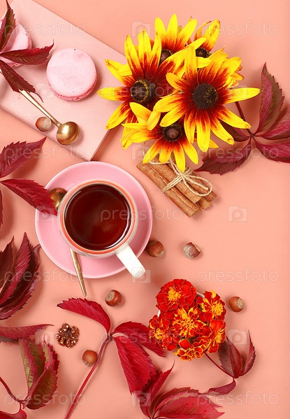 Осенняя открытка с горячим чаем в стеклянной чашке, орехами и специями на фоне сезонных цветов и листьев, уютная теплая концепция, привет осень, стиль хюгге, выборочный фокус, вид сверху, место для текста,