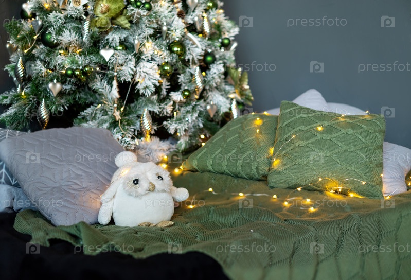 Праздничный домашний интерьер с декоративными подушками, разбросанными по полу под богато украшенной рождественской елкой, зажженной гирляндой и милой игрушкой на диване