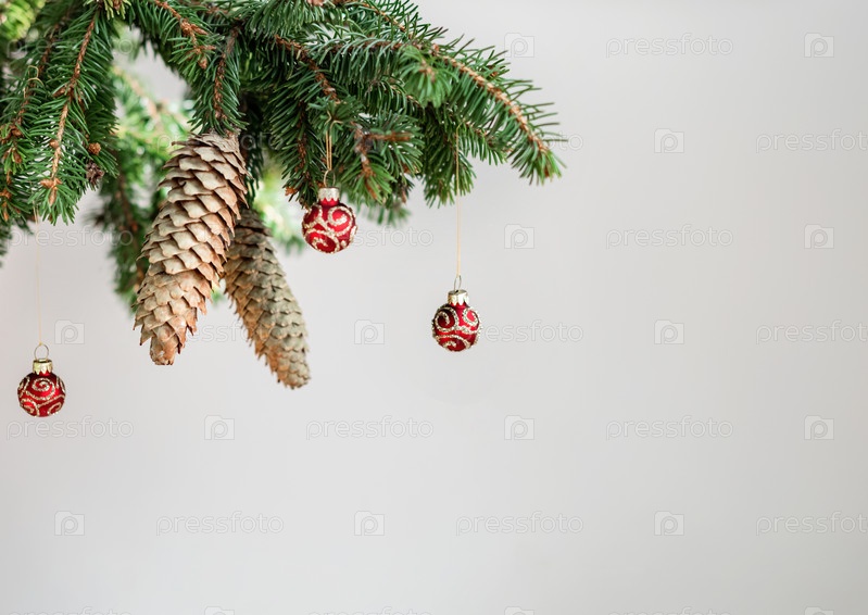 Рождественская рамка из еловых ветвей, еловых шишек и красных блестящих шаров на белом фоне