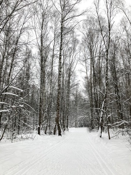 Снежная дорога через березовую рощу зимний лесной пейзаж