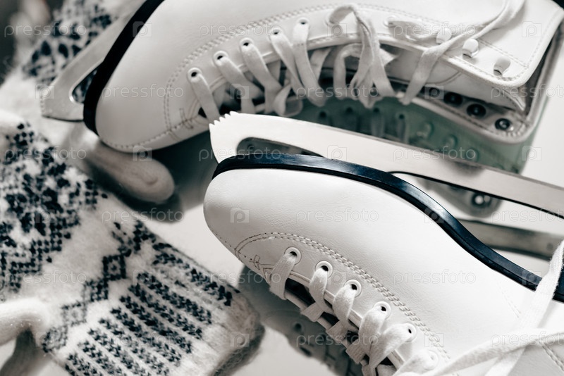 Женские белые сапоги для катания на коньках и теплые вязаные варежки, вид сверху