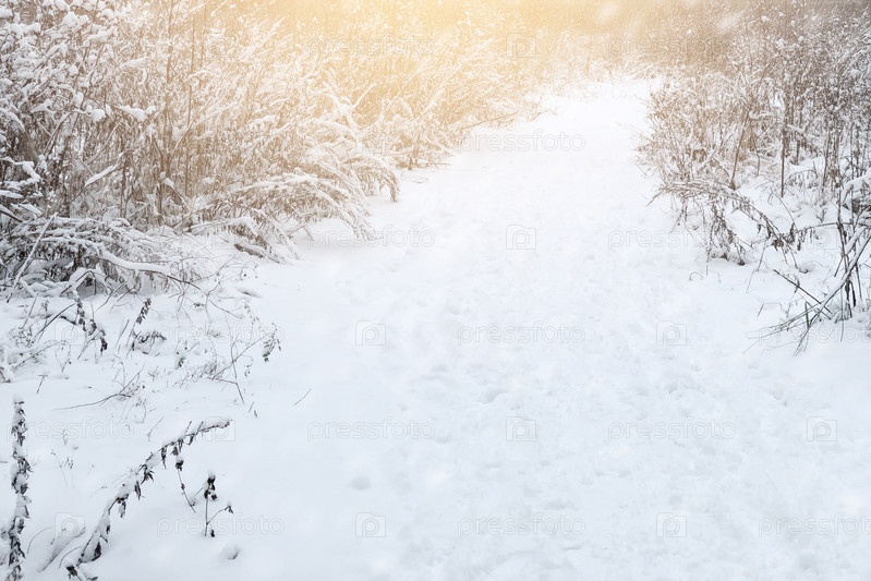 Снежная зимняя дорога в солнечном свете среди кустов, покрытых снегом