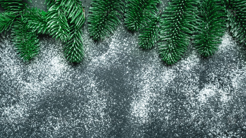 Рождественский фон с зелеными свежими еловыми ветками на темной заснеженной поверхности