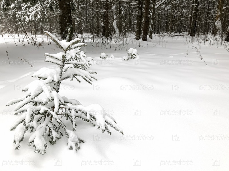 Маленькая ель, покрытая снегом, выбирается из сугроба в зимнем лесу