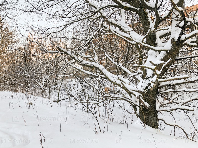 Большое дерево с покрытыми снегом безлистными ветвями в зимний сезон