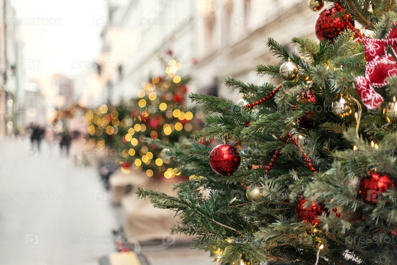 Рождественские елки, украшенные шарами и гирляндами на улице города. Концепция празднования счастливого Рождества и Нового года
