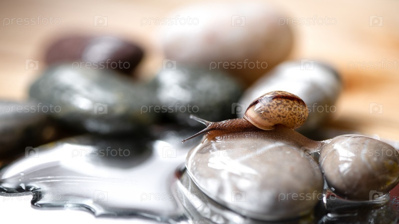 Лесная дикая улитка сидит на большом камне и смотрит в зеркало воды