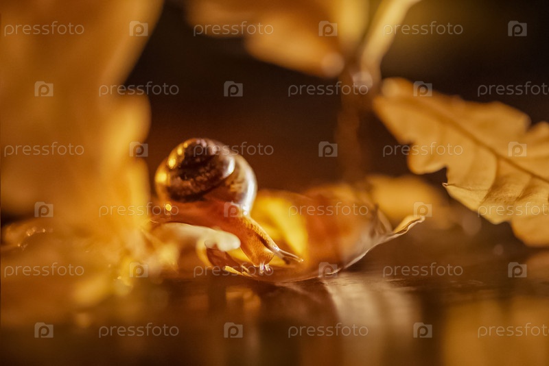 Крошечная улитка смотрит на свое отражение в воде
