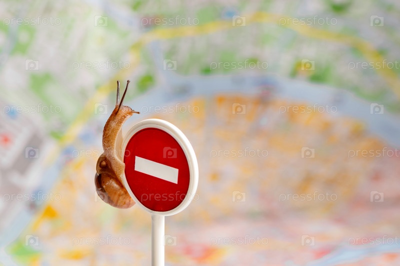 Крошечная улитка с рогами ползает вокруг запрещающего кирпичного дорожного знака на фоне карты города