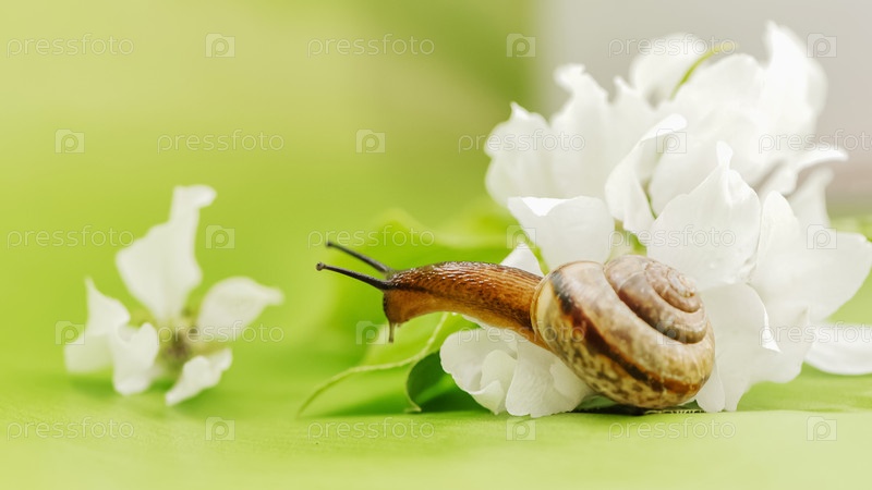 Маленькие цветы улитки и белые яблоки на ярко-зеленом фоне. Концепция весеннего времени и периода цветения