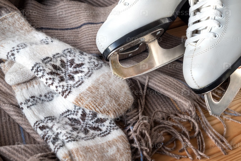 Белые коньки для фигурного катания, теплый шарф и варежки. Зимние виды спорта