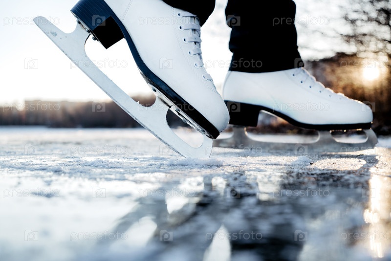 Женщина в белых фигурных коньках стоит на льду. Зимние занятия спортом на свежем воздухе