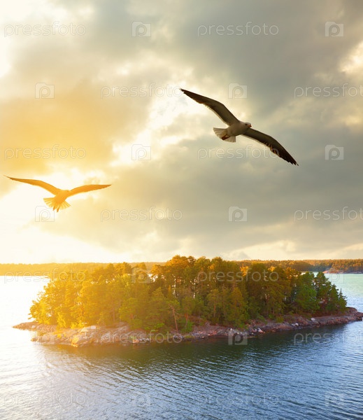 Закатный пейзаж с чайками