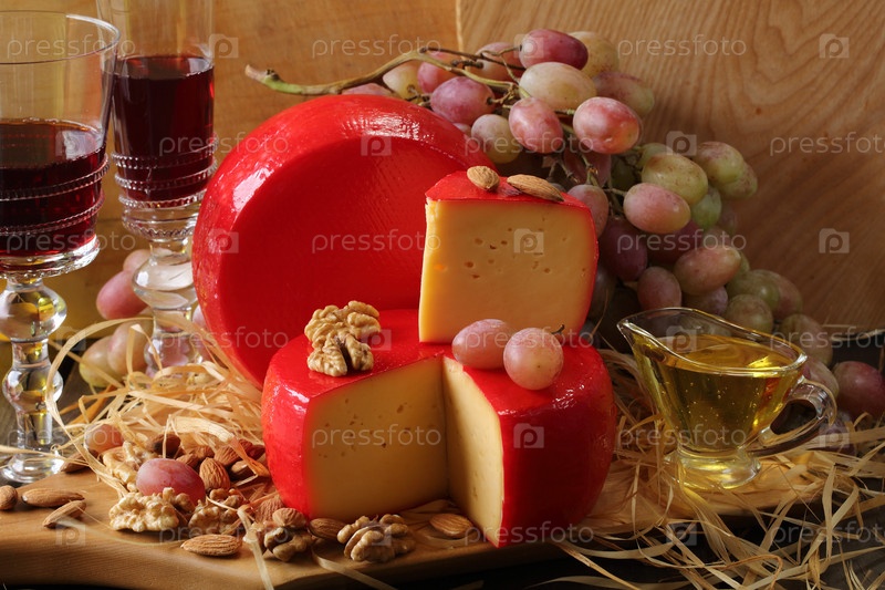 Сыр качотта с виноградом,орехами и вином на деревянном фоне