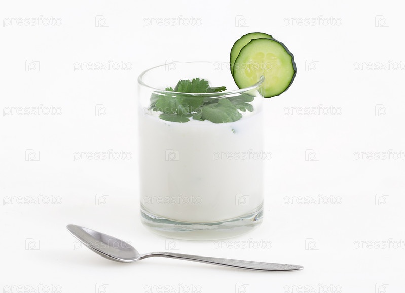 Коктейль из кефира с огурцом на белом фоне