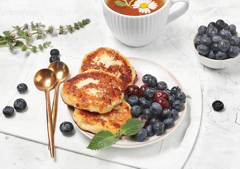 Оладьи с черникой, медом и ромашковым чаем на светлом фоне. Концепция здоровой и натуральной пищи. Здоровый завтрак с ингредиентами, еда для детей. выборочный фокус, плоская планировка,