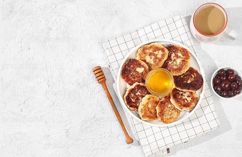 Оладьи с вишней, медом и кофе на светлом фоне. Концепция здоровой и натуральной пищи. Здоровый завтрак с ингредиентами, еда для детей. выборочный фокус, плоская планировка