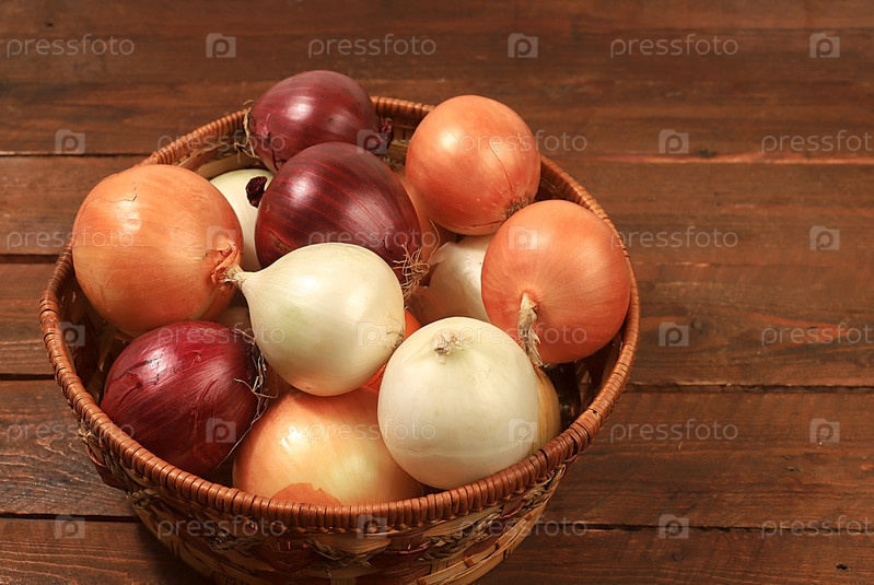 Различные сорта лука в корзине на деревянном фоне, концепция осеннего урожая, красный, белый и золотой лук для разведения в сельском хозяйстве, селективный фокус