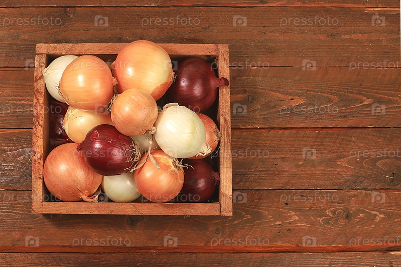Различные сорта лука в коробке на деревянном фоне, концепция осеннего урожая, красный, белый и золотой лук для разведения в сельском хозяйстве, селективный фокус
