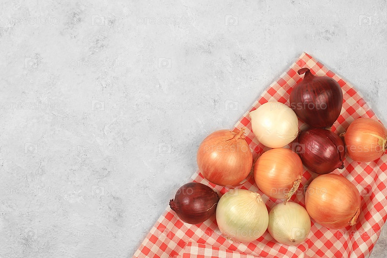 Различные сорта лука на сером бетонном фоне, концепция сбора урожая осенью, красный, белый и золотой лук для разведения в сельском хозяйстве,