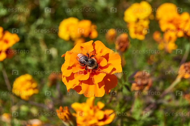 Шмель собирает пыльцу и нектар с цветков бархатцев. Осень