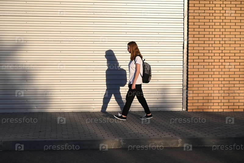 Девочка-подросток в черных брюках и белой футболке идет по улице с черным рюкзаком на спине
