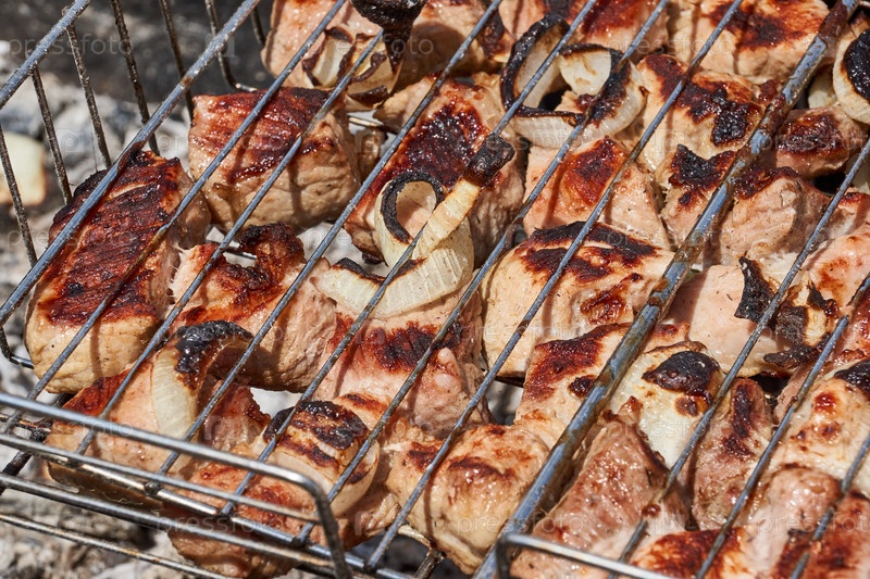 Мясо жарят над раскаленными углями в жаровне на решетке. На углях приготовят шашлык. Крупный план