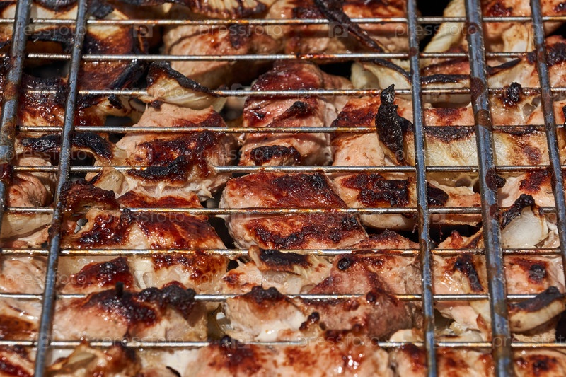 Мясо жарят над раскаленными углями в жаровне на решетке. На углях приготовят шашлык. Крупный план