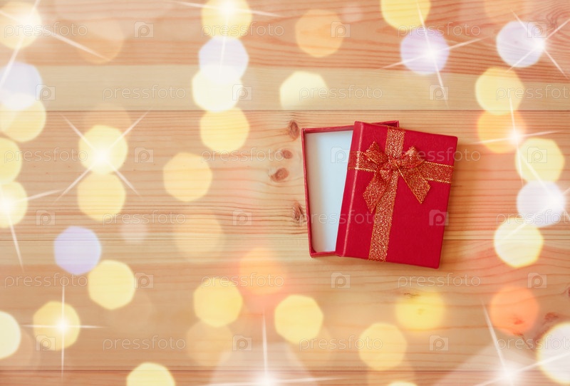 Открытая красная подарочная коробка на деревянном фоне. Вид сверху с копией пространства